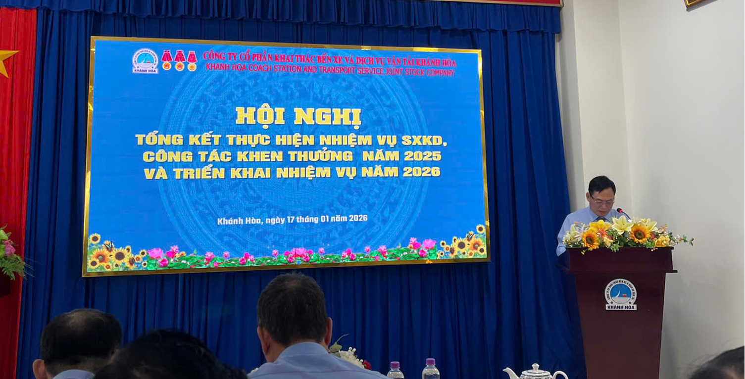 Sáng ngày 17/1/2026, Công ty CP Khai thác bến xe và Dịch vụ vận tải Khánh Hoà tổ chức Hội nghị “Tổng kết thực hiện nhiệm vụ sản xuất kinh doanh, công tác khen thưởng năm 2025 và triển khai nhiệm vụ năm 2026”.[Chi tiết] |